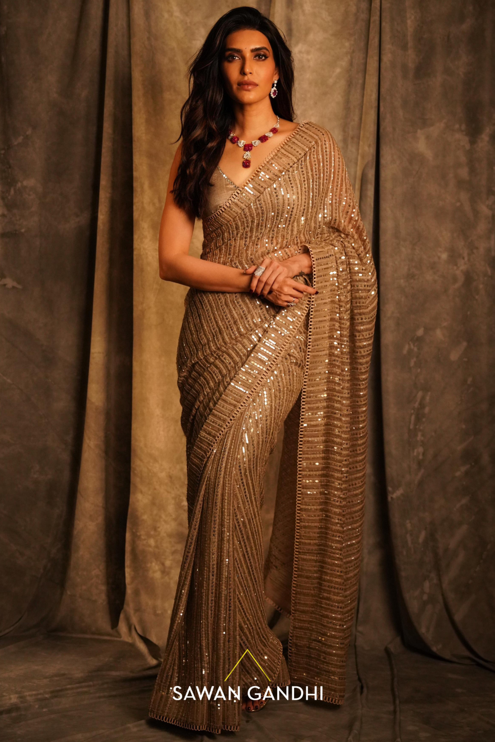 Karishma tanna in TAUPE GHICHA ORGANZA SAREE SET