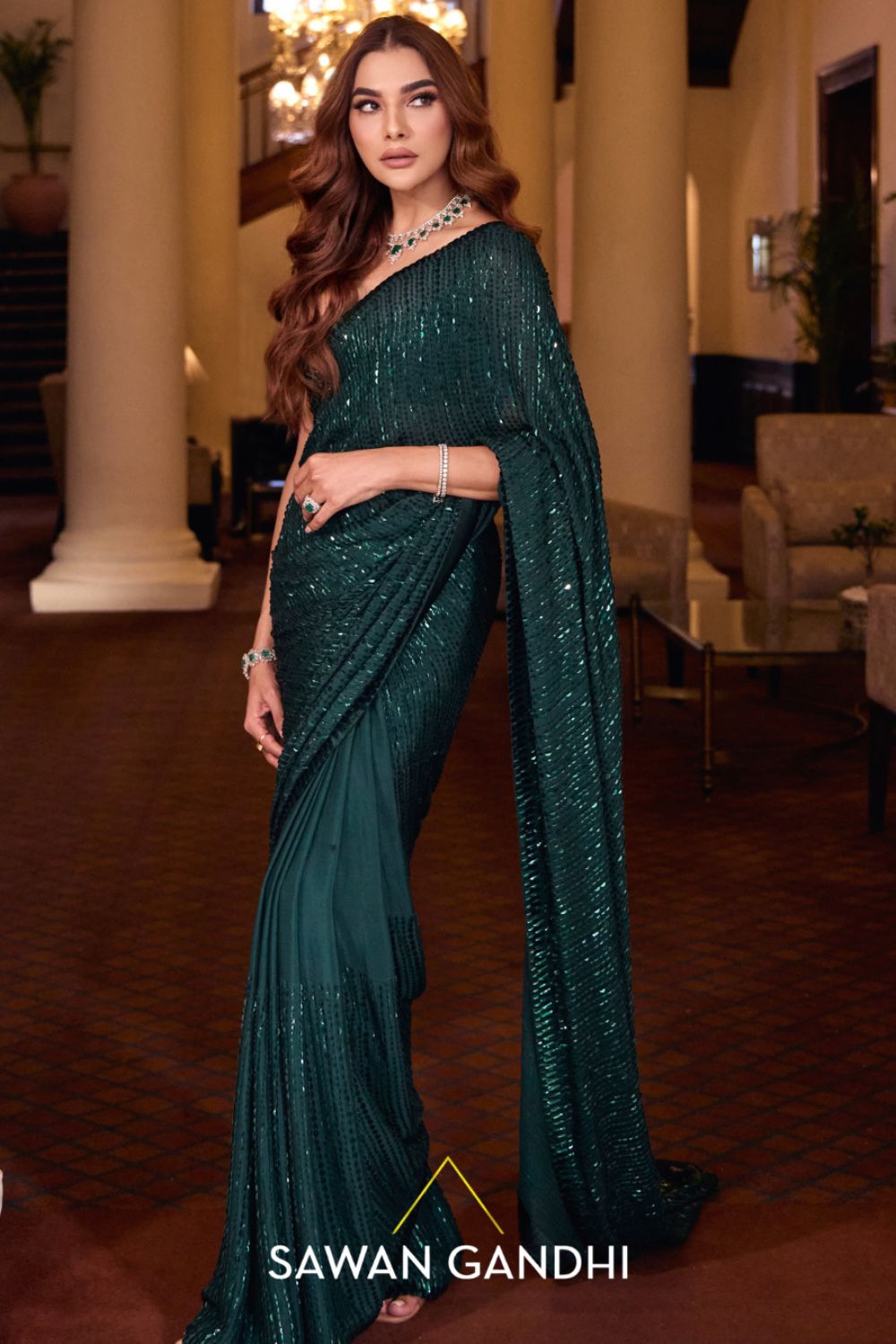 Bottle Green Kashti saree is hand embroidered with trims which are scattered all over the saree with a beautiful heavy work border across the saree.It is paired with a kashti work blouse and a petticoat.
