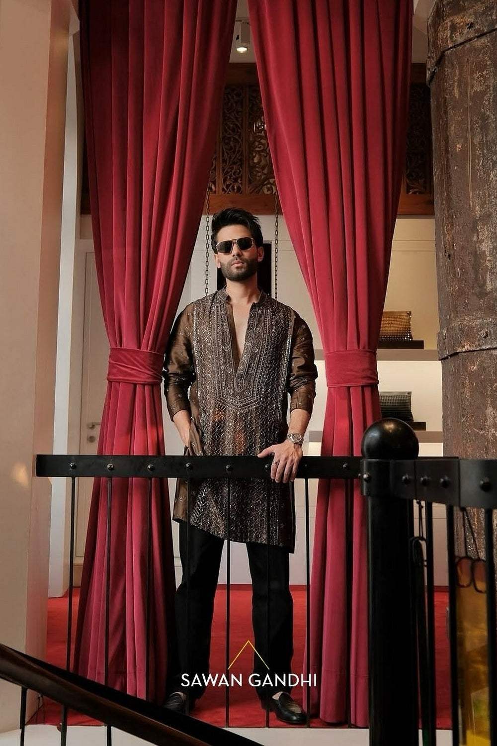 A classic brown kurta highlighted with intricate chikankari embroidery across the front, creating a refined texture. Styled with black pants for an effortlessly elegant traditional look.