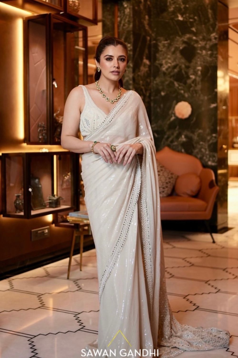 Ivory paani sequins saree with Chikankari work on the palla paired with a pearl work blouse and a petticoat