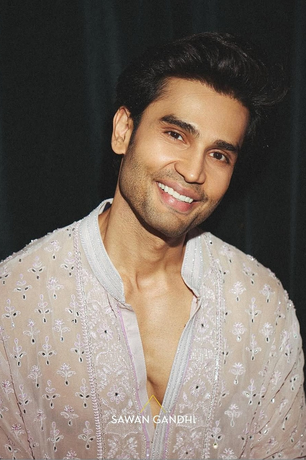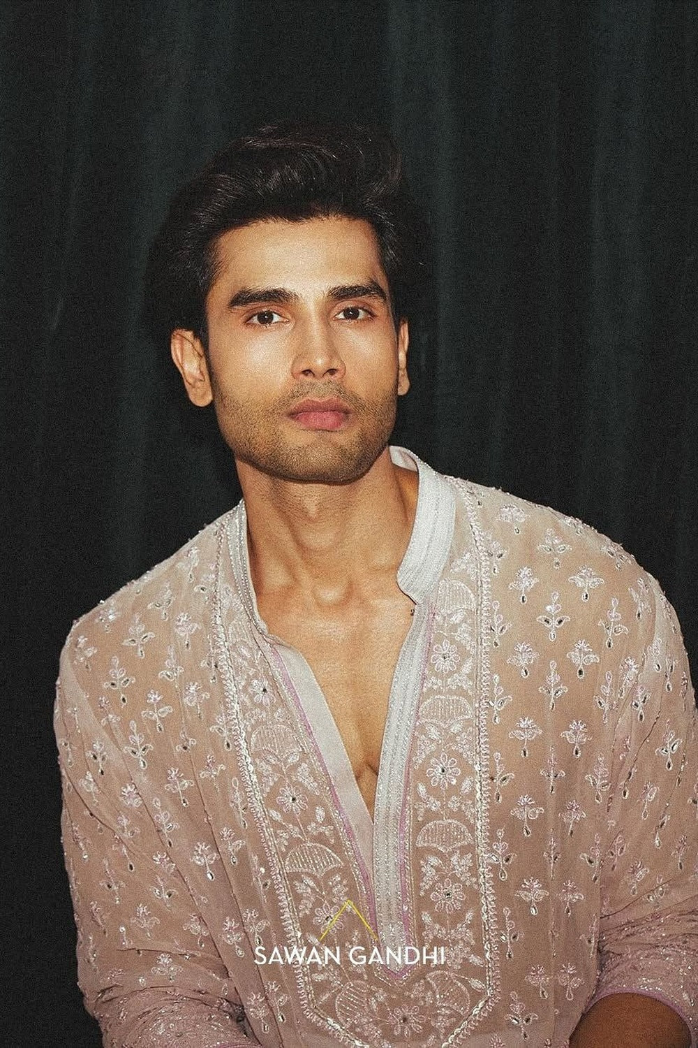 A lilac kurta with chikankari and mirror work and an intricately, detailed neckline paired with ivory raw silk pants.
