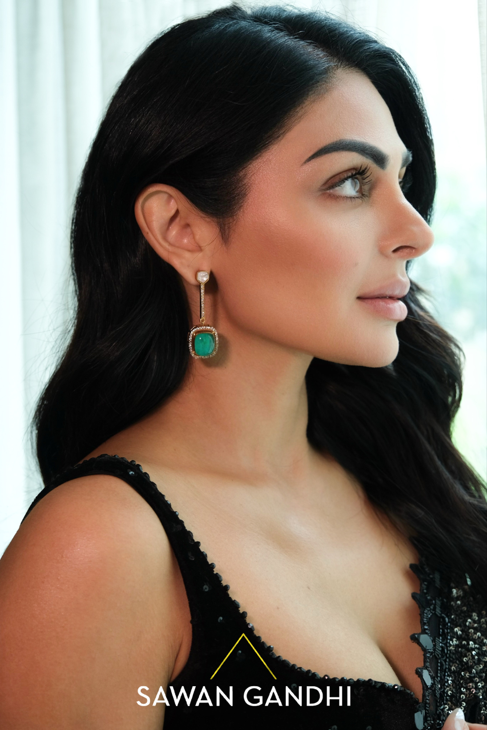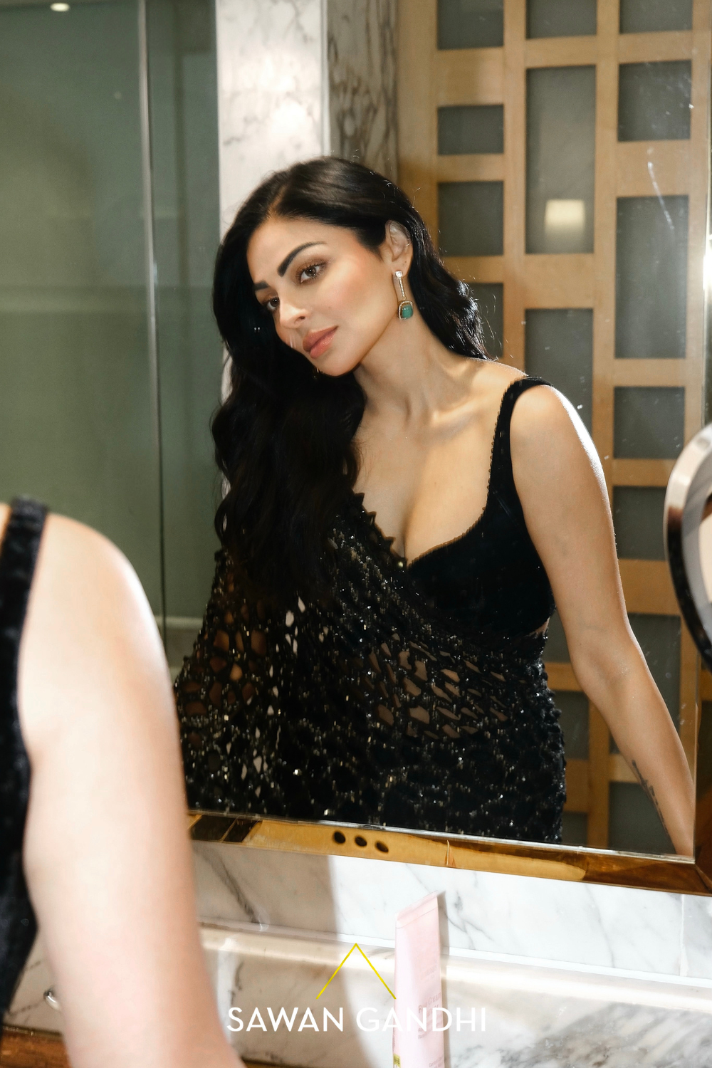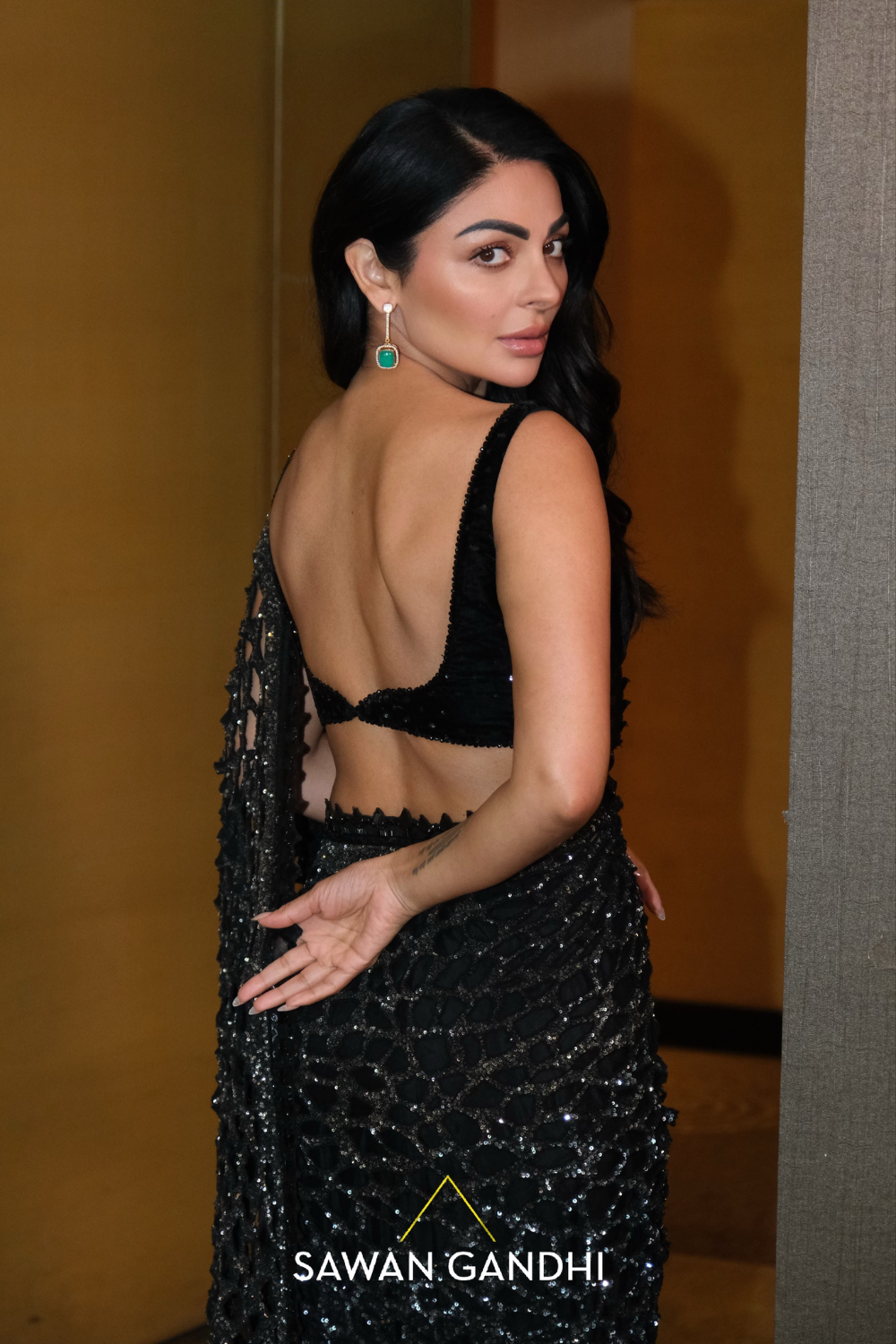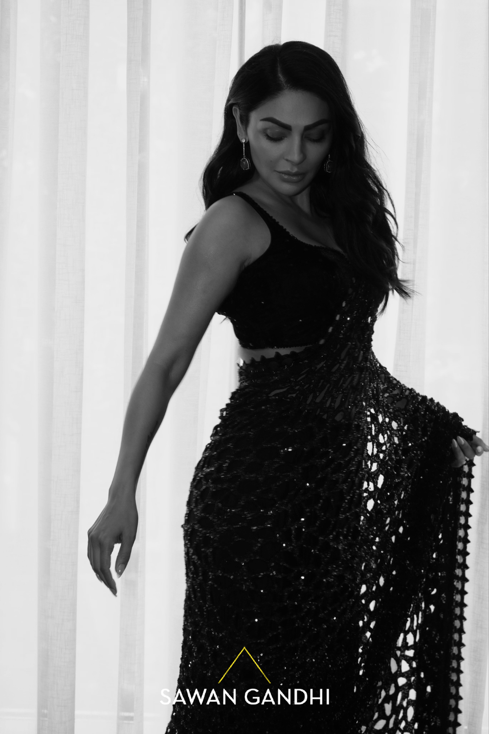 A black to grey ombre cutwork saree featuring a graceful transition from grey to black ombre sequins detailing, elegantly paired with a black velvet blouse and a petticoat .