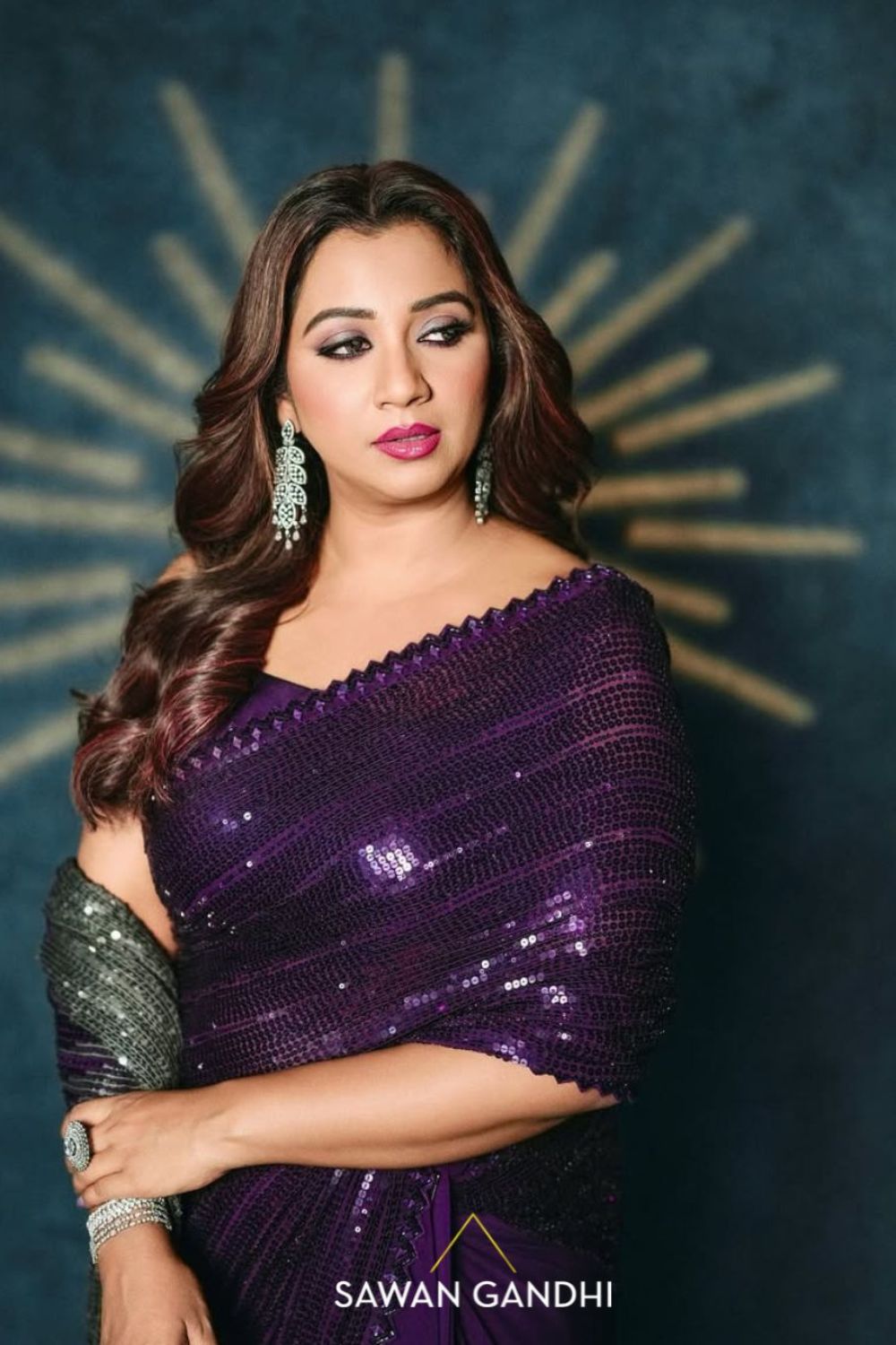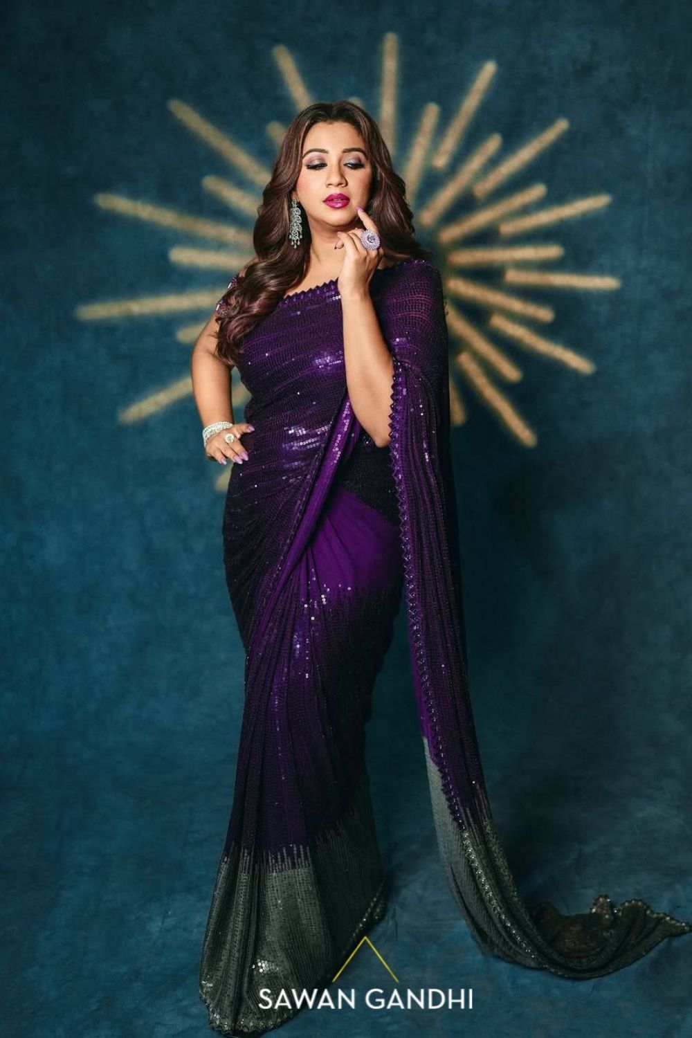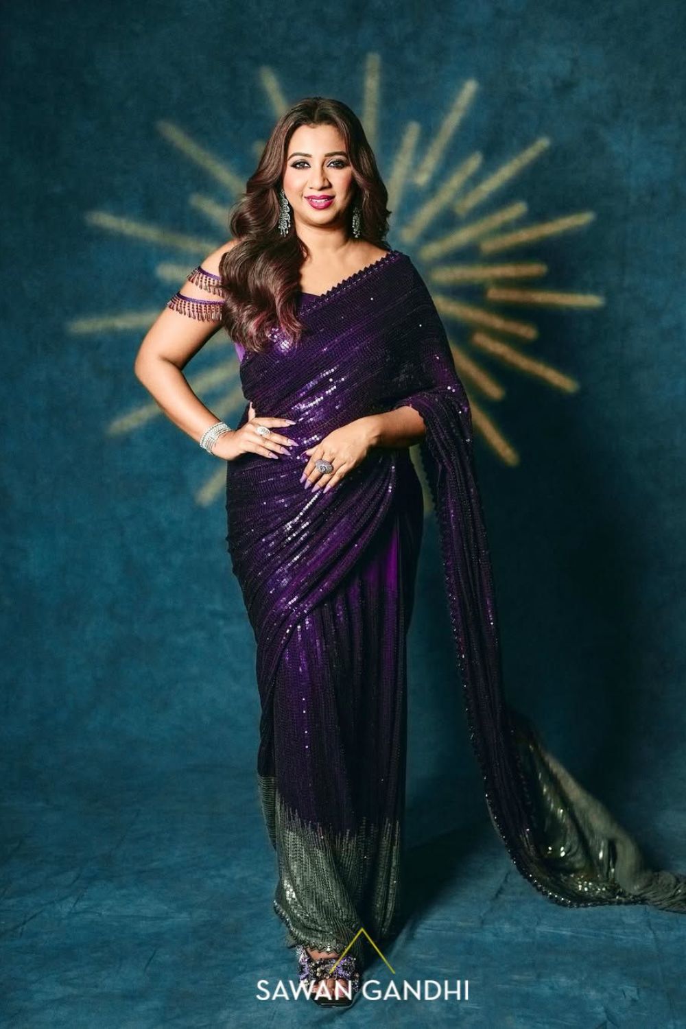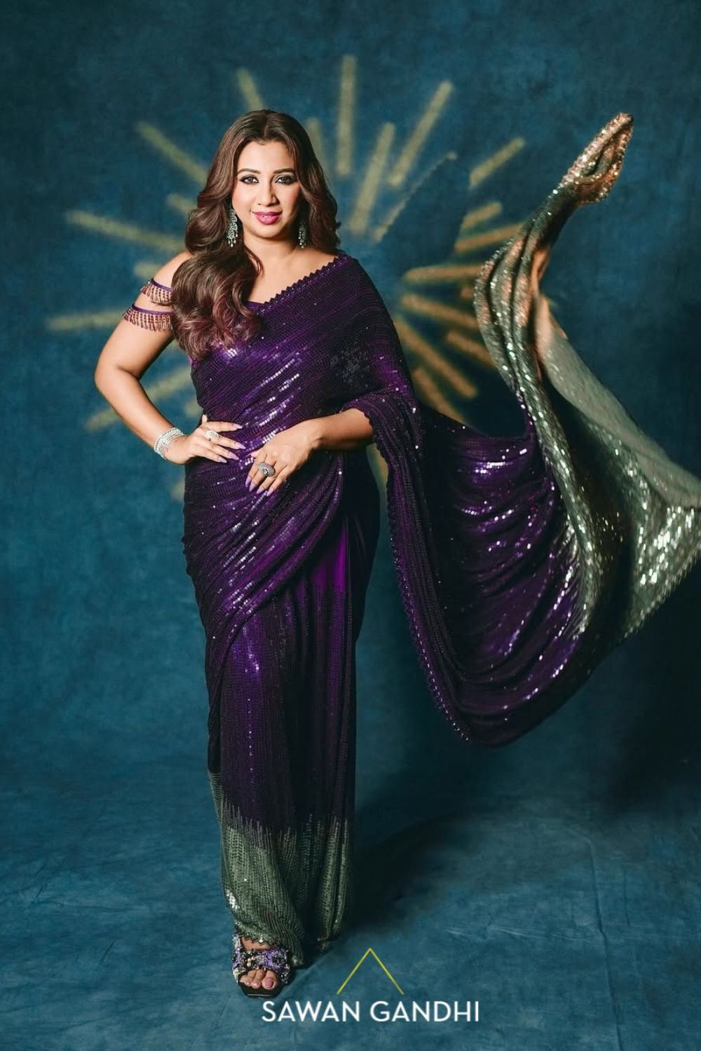 Wine to grey ombre sequins saree paired with a satin blouse and a petticoat