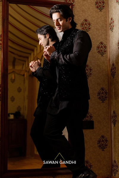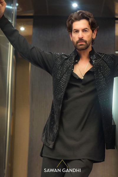 Black Cutdana Lines Nehru With Swarosvki Kurta