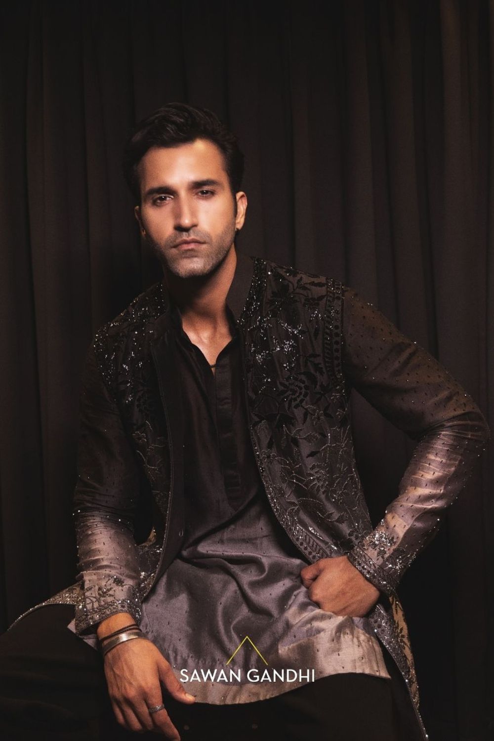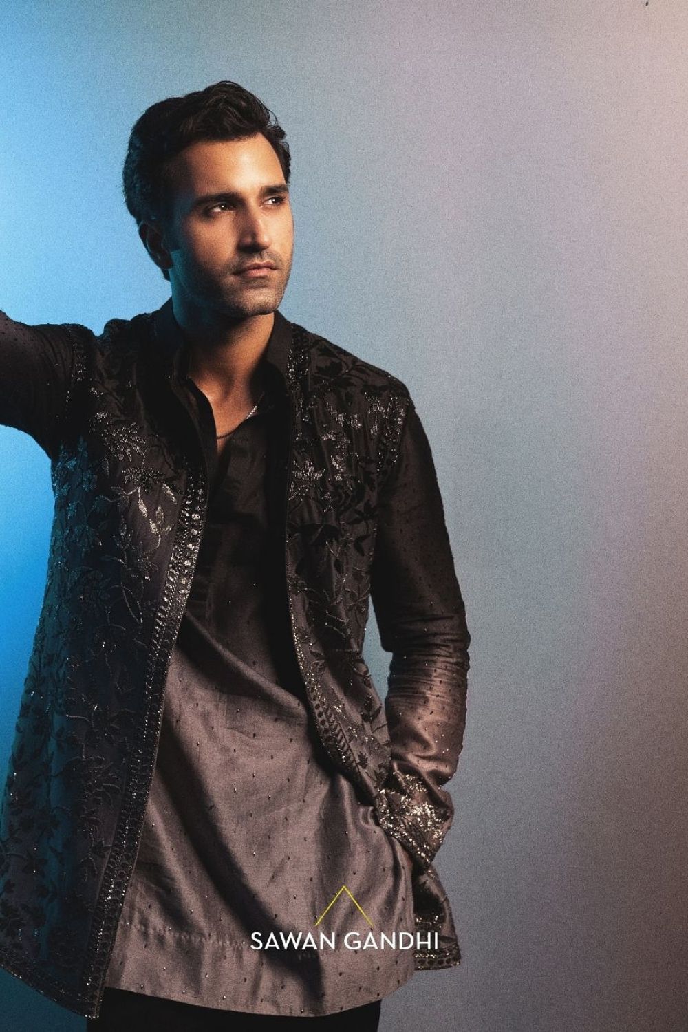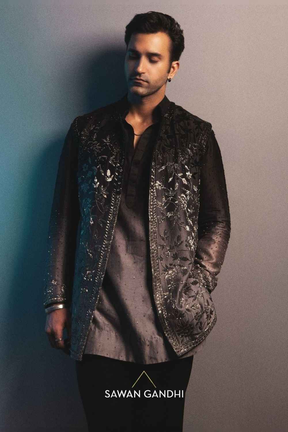 Black to Grey Nehru is crafted with floral embroidery embellished with intricate cutdana detailing. It is paired with same ombré colour kurta with cutdana embroidery on cuffs matching the Nehru.