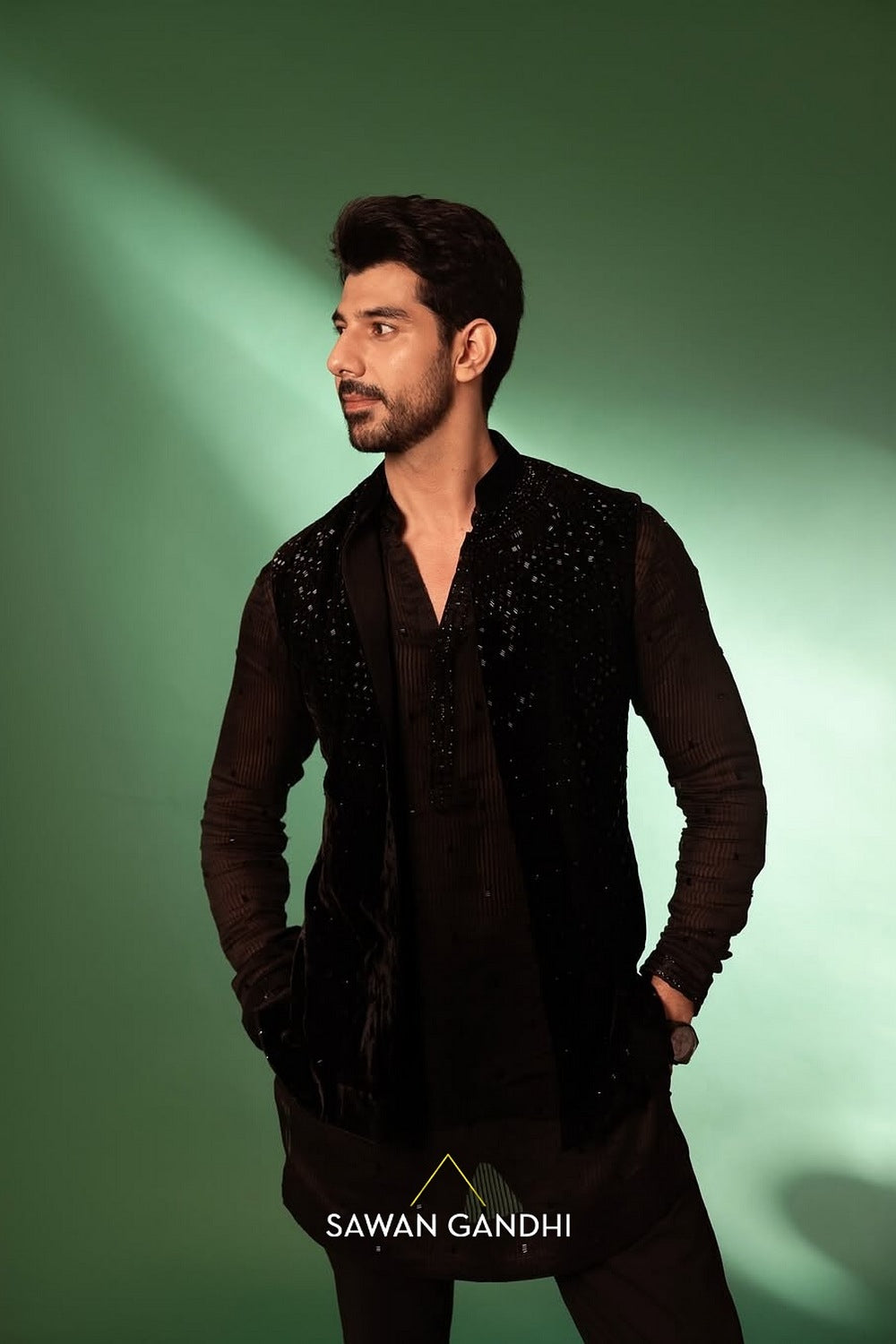 Black velvet nehru with scatter cutdana work paired with cutdana work kurta and black pants