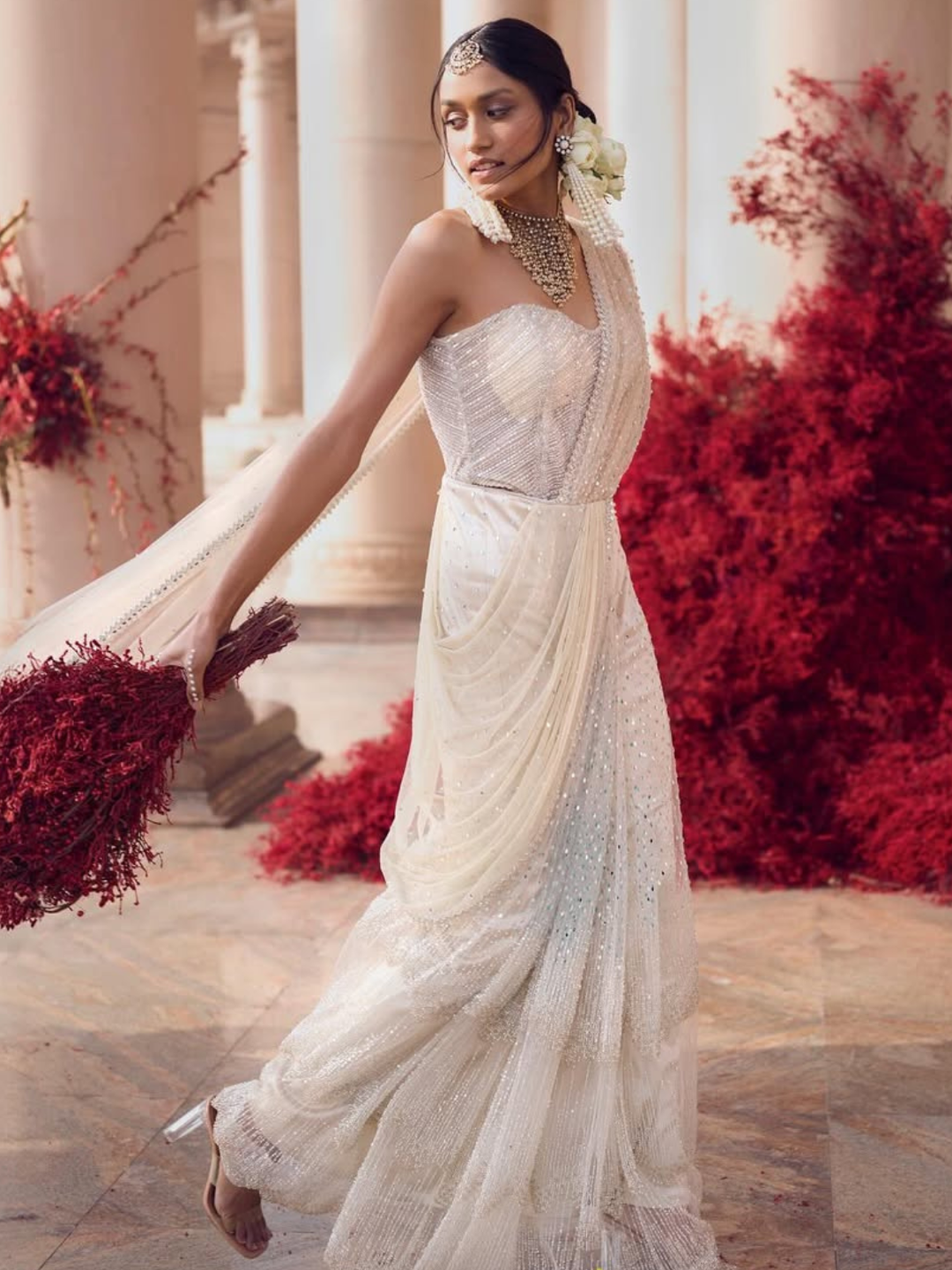 Steel grey saree with sequins lines detailing paired with a sequin blouse.