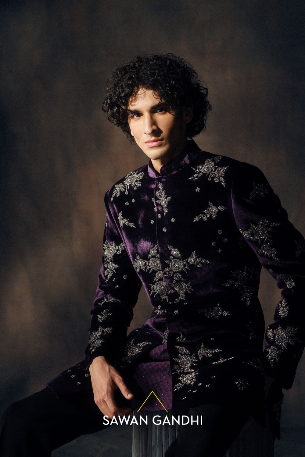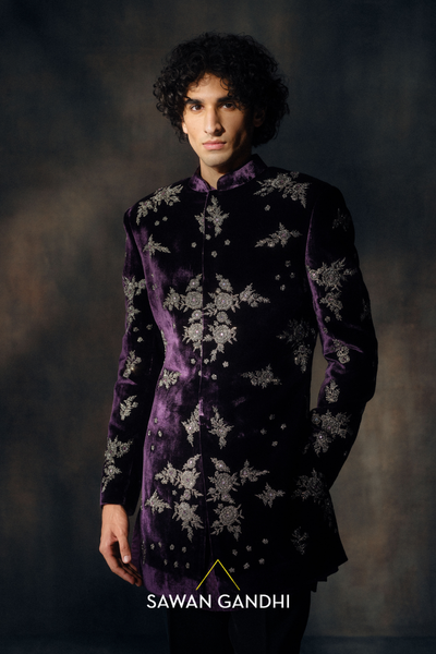 Wine velvet sherwani featuring rich, all-over Cutdana Embroidery. The plush velvet fabric is entirely adorned with intricate, shimmering Cutdana work