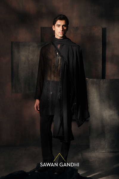 This sheer black kurta features a contemporary pattern of shimmering Swarovski embellishments arranged in sharp, stacked V-shapes across the body. Stole is additionally prices at 48,000/-