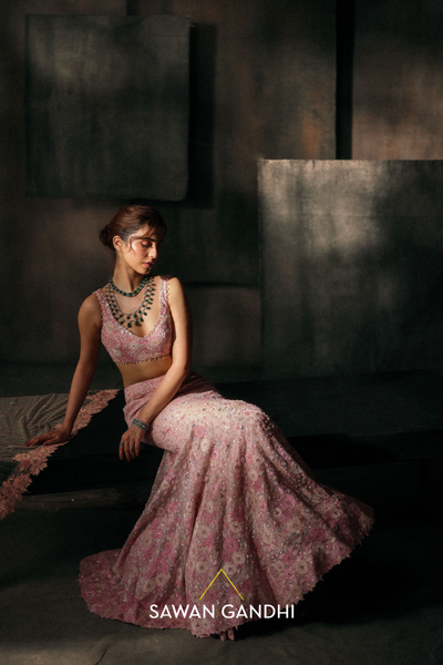 Blush pink fishcut skirt with applique , sequins and cutdana embroidery paired with applique work blouse and cape with mirror,sequins and applique detailing.