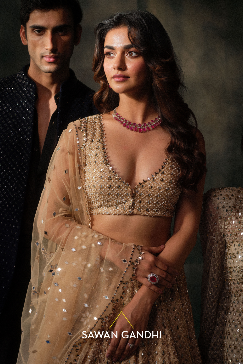 gold ombre lehenga with mirror, bead work and sequin embroidery, paired with a embellished blouse and sheer dupatta with patra detailing.