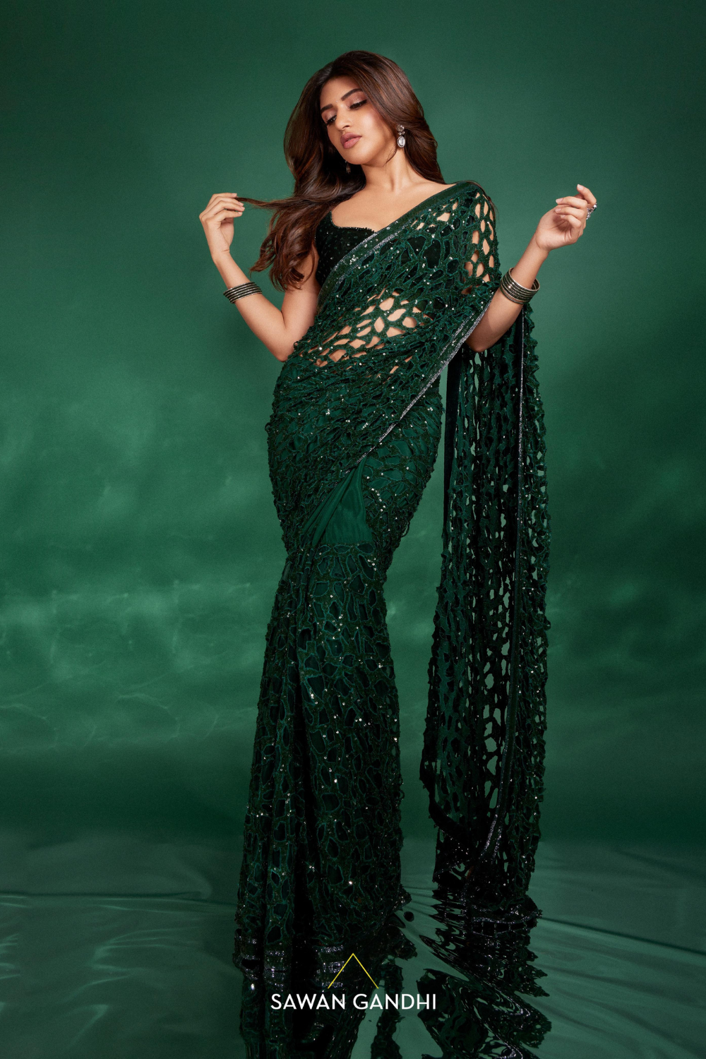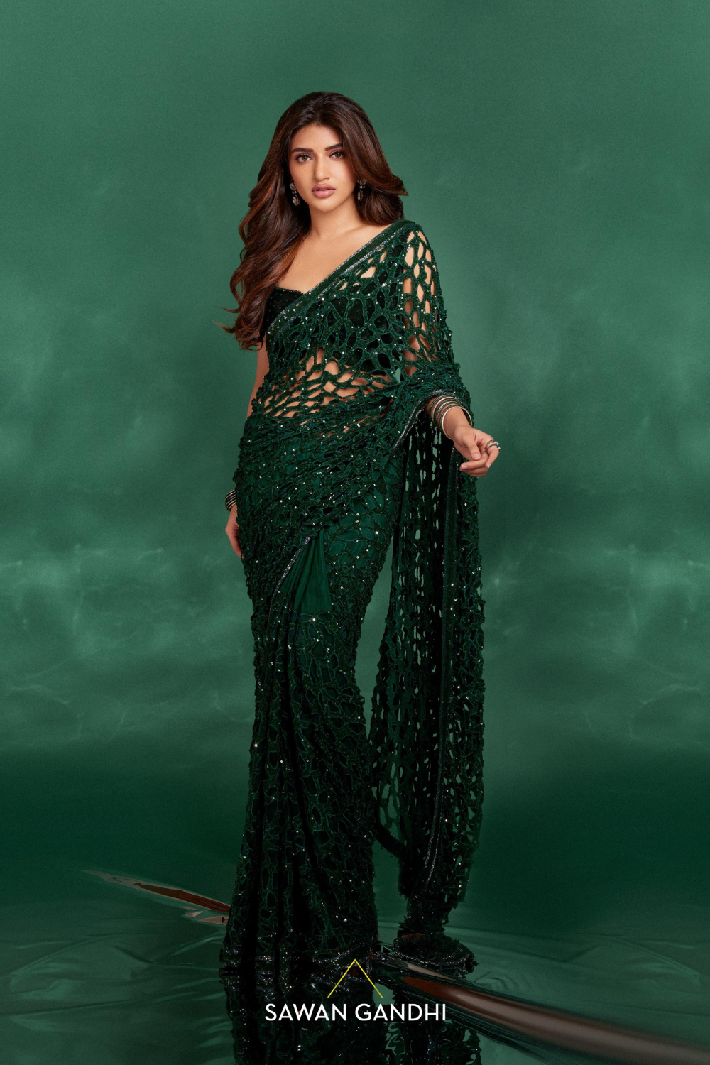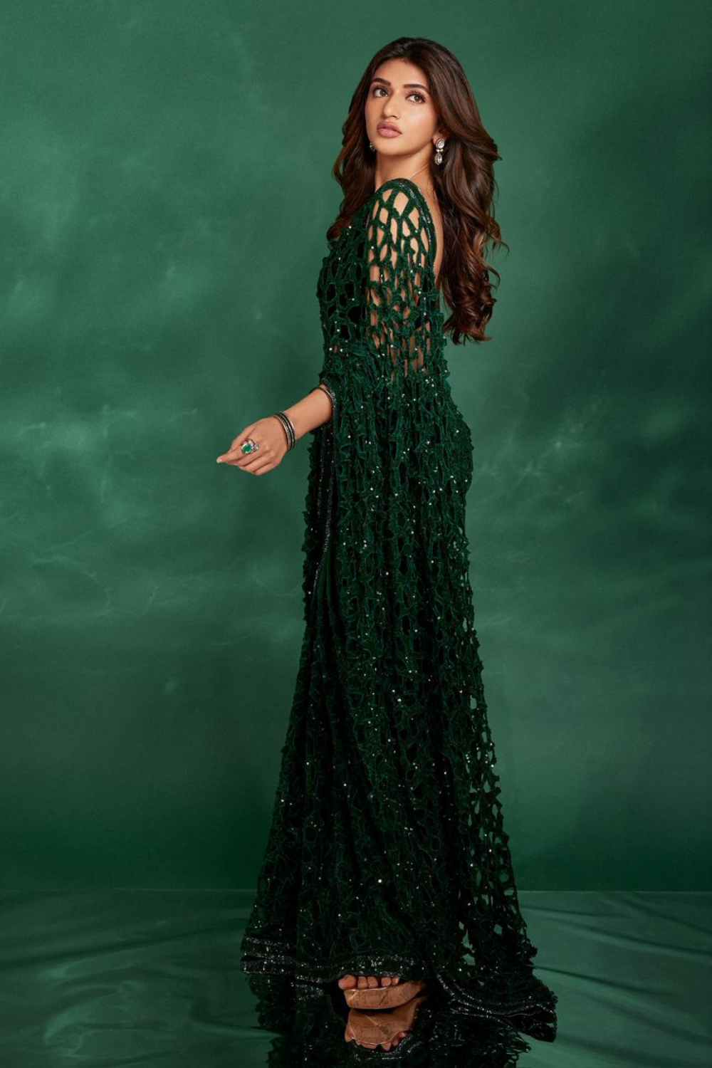 Green cutwork saree with sequins detailing , paired elegantly with a green velvet crystal work blouse.components- 3 Fabric- GeorgetteColor- Green
