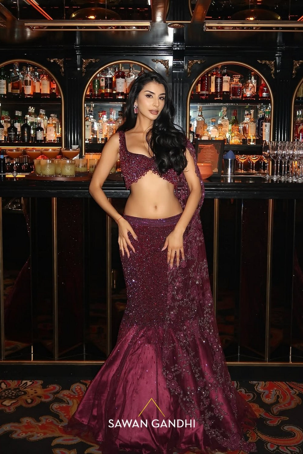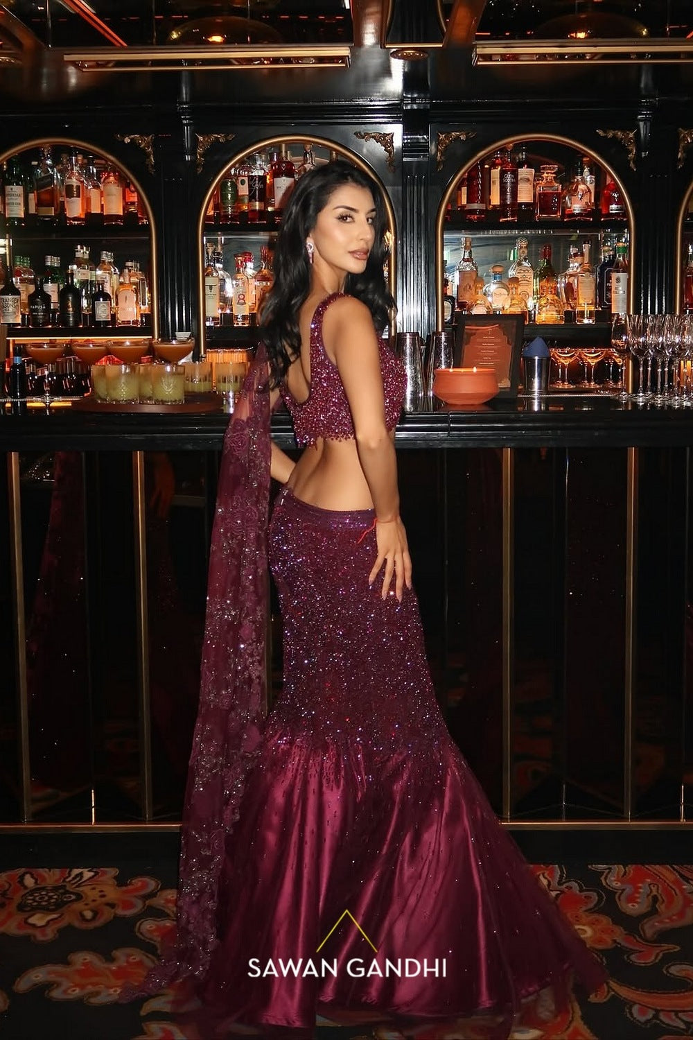 Wine swarosvki embroidered fishcut skirt paired with tassel blouse and net drape